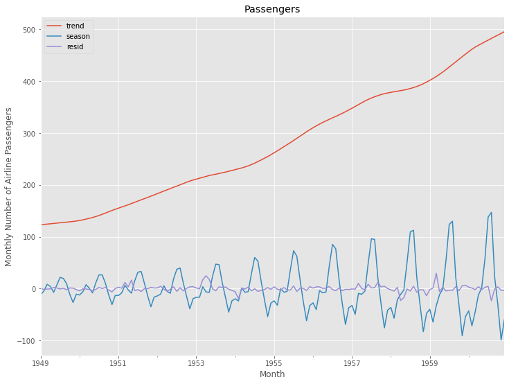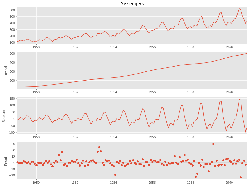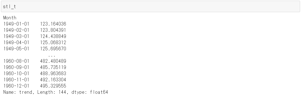 # STL分解 stl=STL(table['Passengers'], period=12, robust=True) stl_series = stl.fit()