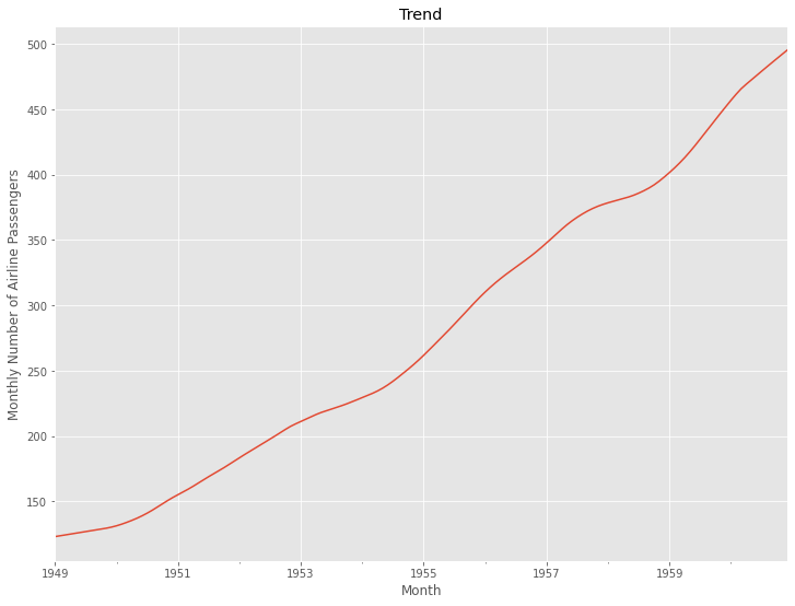 plt.ylabel('Monthly Number of Airline Passengers') #タテ軸のラベル