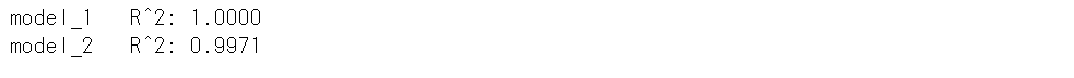 元の特徴量のデータセットを使った方の決定係数は100%と高精度です。一方、特徴量を絞った新たな特徴量のデータセットを使った方の決定係数は99.71%と精度が若干落ちます。