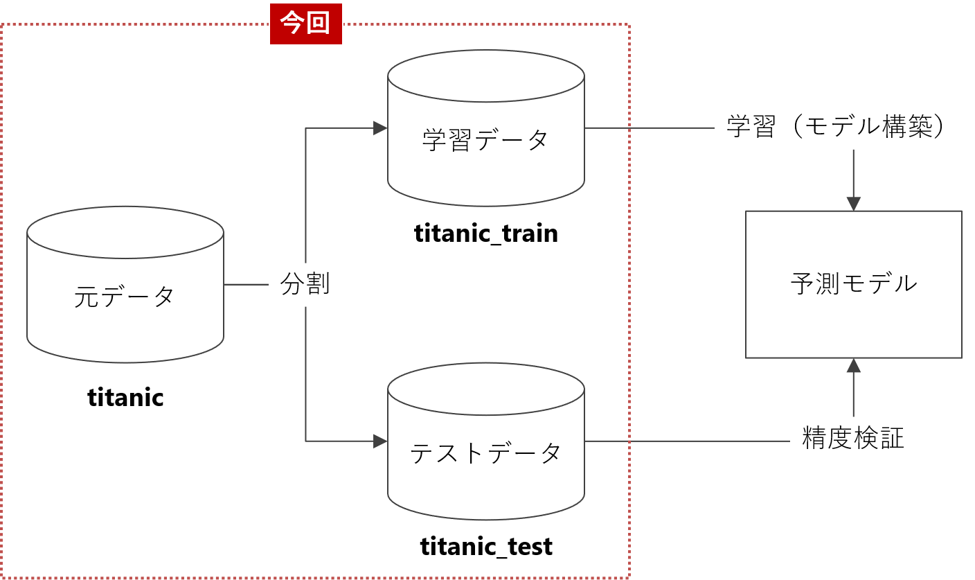 以下は、タイタニック(titanic)データを、学習データとテストデータに分割するまでの流れをまとめた画像(GIF)です。