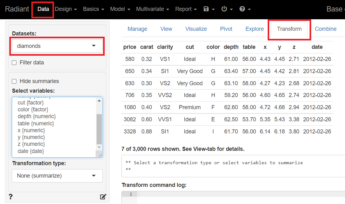 メニューの「Transform」ボタンをクリックし、変数変換画面(Transform)を表示させます。