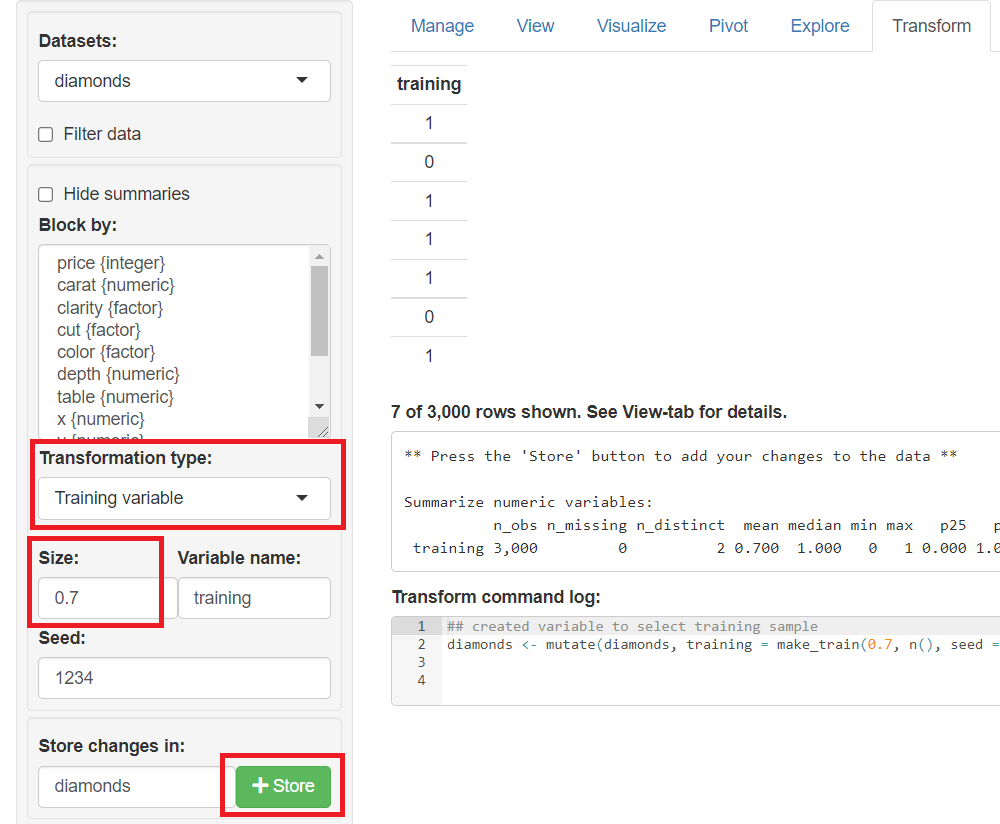 左下の「Transformation type」から「Training variable」を選択します。次のような画面が表示されるので、どのような分割をするのかを設定(例えば、Sizeで学習データの割合を指定)し、「Store changes in」の「+Store」ボタンをクリックし新変数「training」を追加します。