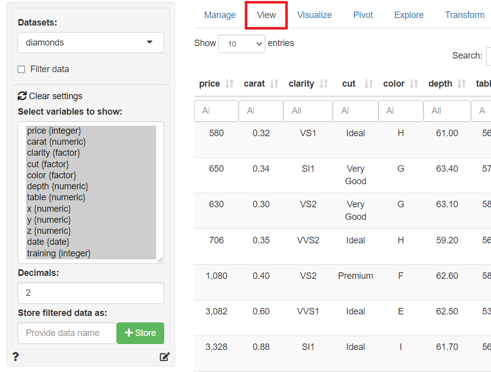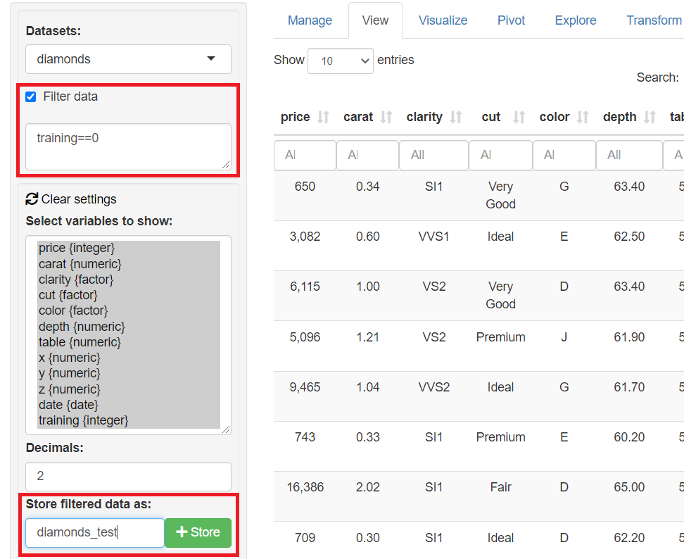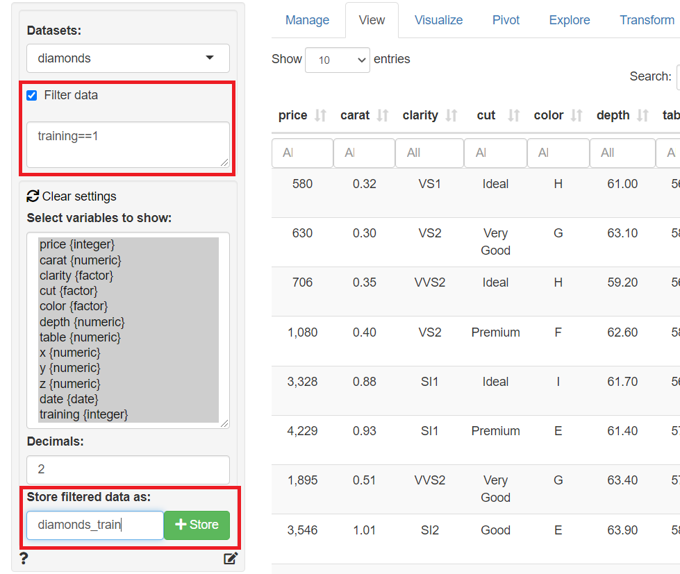 作成したフラグ変数(training)に対し、表示条件を指定し絞り込み、学習データ(train)のみを表示し保存します。「Store filtered data as」に「データセット名称」を指定し、右隣りにある「+Store」ボタンをクリックし保存します。