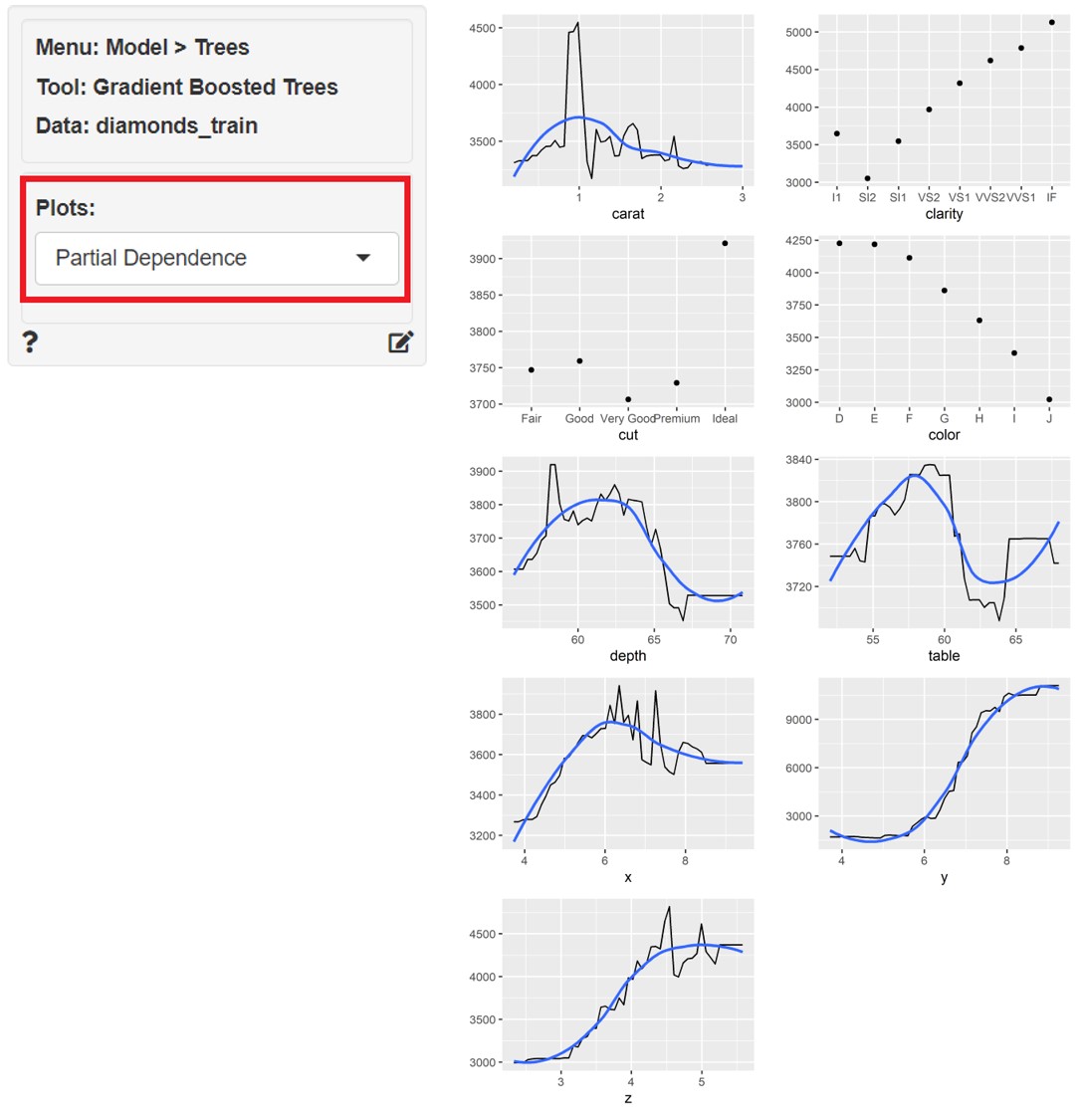 左上の「Plots」に「Partial Dependence」を指定すると、目的変数と各説明変数の関係性をグラフ化したものが表示されます。
