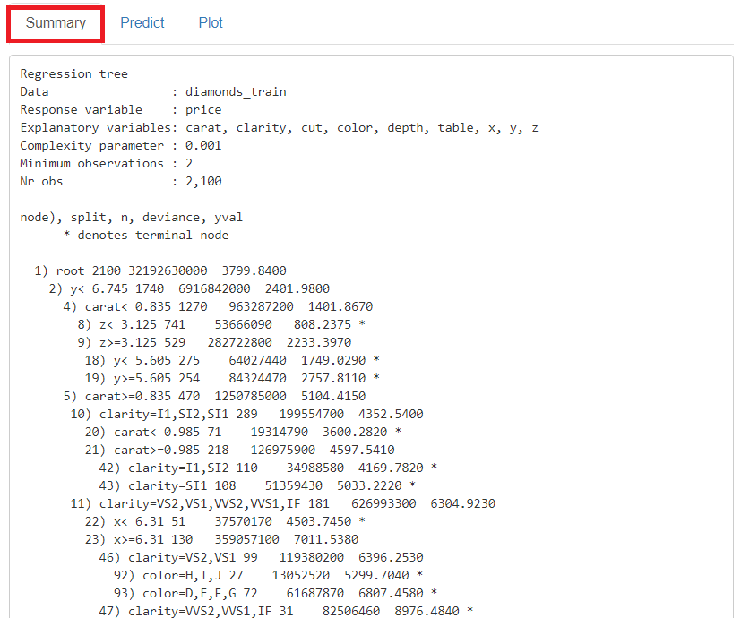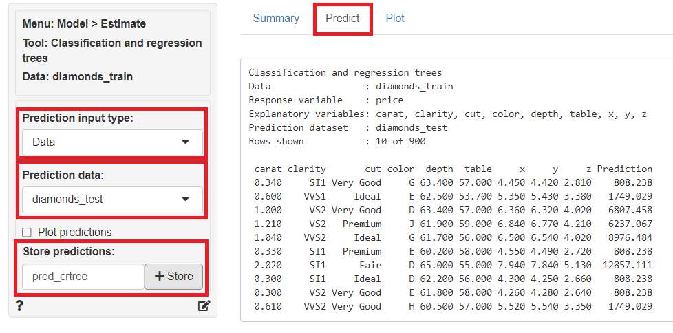 「Predict」をクリックし、左上の「Prediction Input type」に「Data」を指定、「Prediction data」に「diamonds_test」を指定すると、テストデータ(diamonds_test)の目的変数が予測されます。予測結果は、「Store predictions」に予測結果を保存する変数名(デフォルトではpred_crtree)を入力し「+Store」ボタンをクリックすると、テストデータ(diamonds_test)にその変数が追加され保存されます。