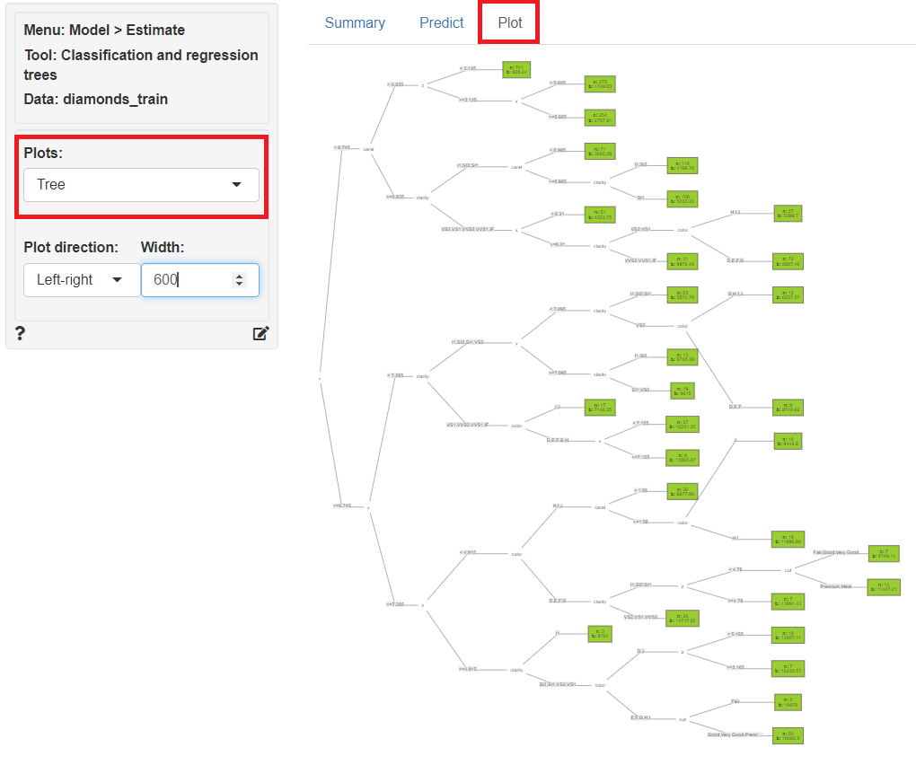 「Plot」をクリックし、左上の「Plots」に「Tree」を指定すると、予測モデルのツリーをグラフ化したものが表示されます。
