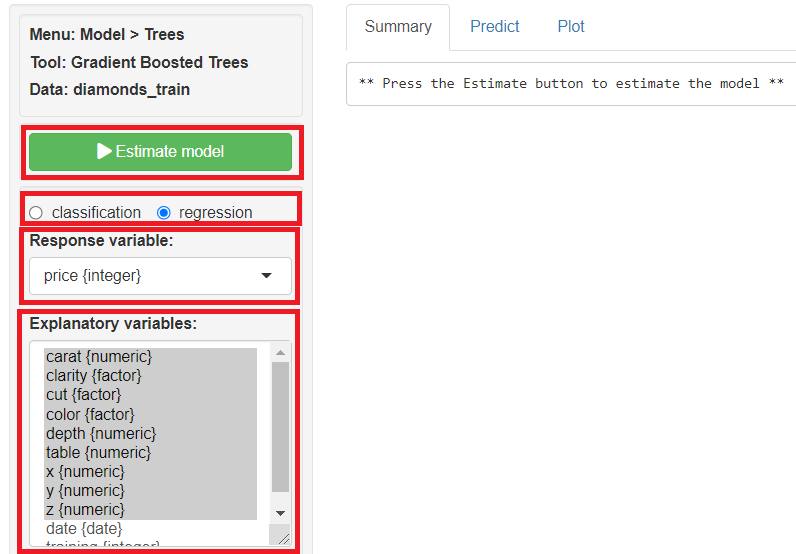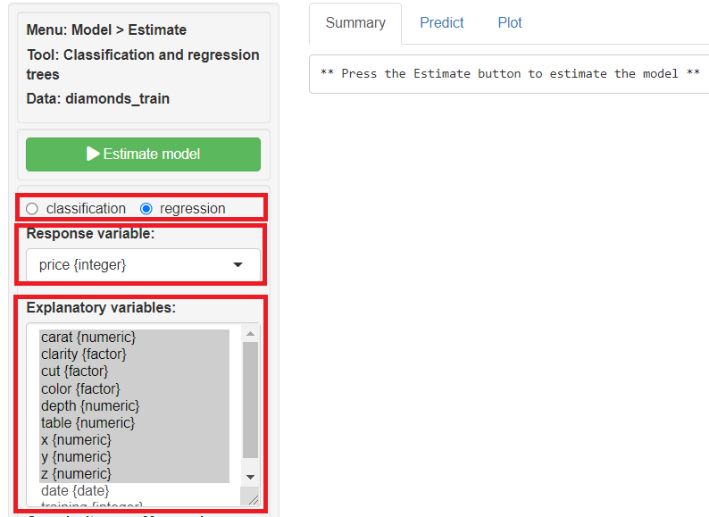 regressionにチェックを入れ、Response variables(目的変数)に「price」、Explanatory variables(説明変数)に「carat」「clarity」「cut」「color」「depth」「table」「x」「y」「z」を指定し、「Estimate model」をクリックし予測モデルを構築します。