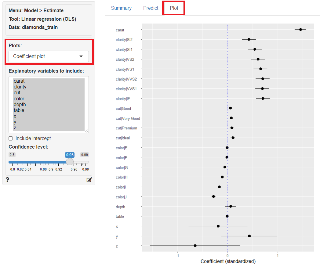 「Plot」をクリックし、左上の「Plots」に「Coefficient plot」を指定すると、各説明変数の係数をグラフ化したものが表示されます。