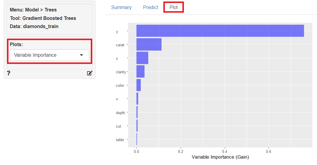 「Plot」をクリックし、左上の「Plots」に「Variable Importance」を指定すると、目的変数に対する各説明変数の重要度をグラフ化したものが表示されます。
