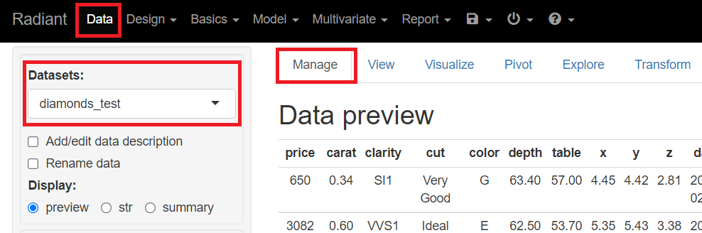 メニューから「Data」を選択し「Manage」をクリックします。左上に表示されている「Datasets」のところを「diamonds_test」にします。