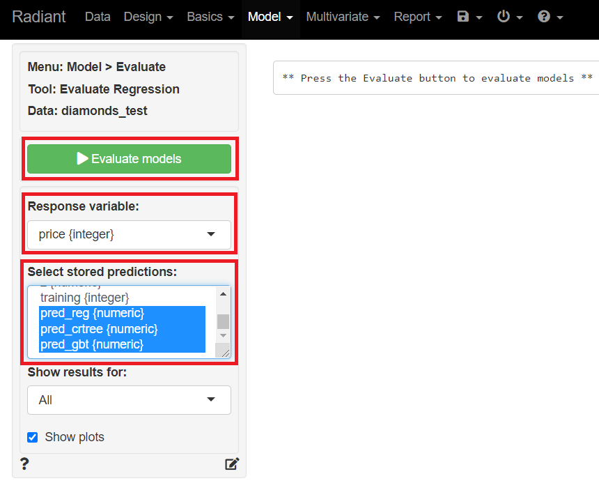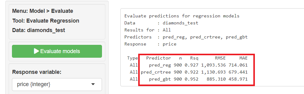 Response variables(目的変数)に「price」、Selected stored predictions(保存してある予測値の選択)に「pred_reg」「pred_crtree」「pred_gbt」を指定し、「Evaluate models」をクリックし予測精度を評価しその結果を表示させます。