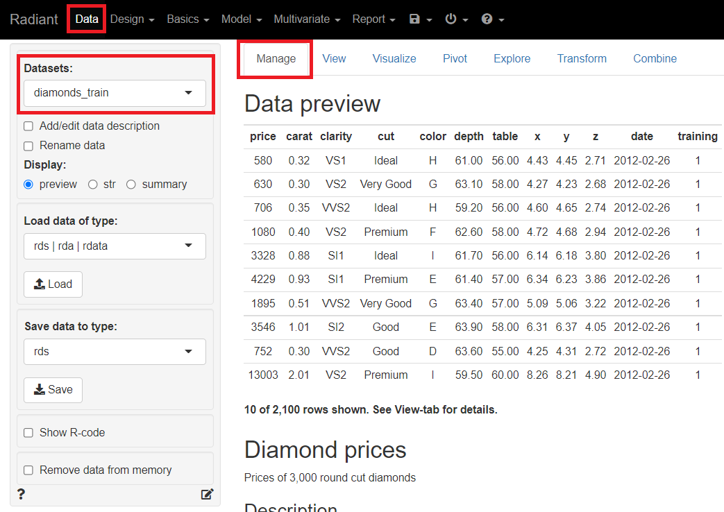 メニューから「Data」を選択し「Manage」をクリックします。左上に表示されている「Datasets」のところを「diamonds_train」にします。
