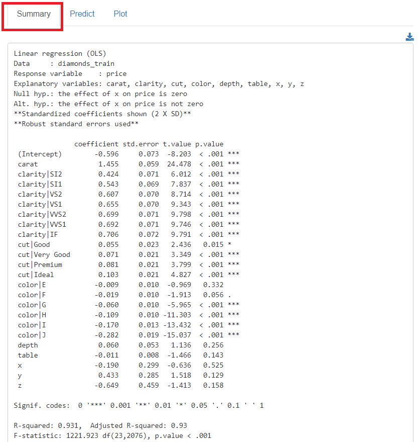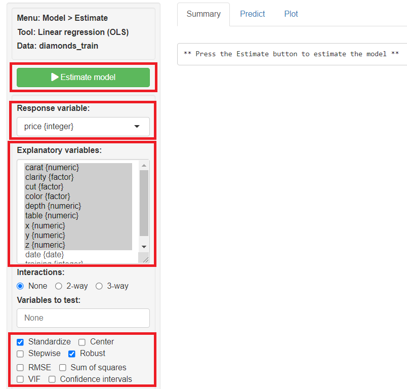 Response variables(目的変数)に「price」、Explanatory variables(説明変数)に「carat」「clarity」「cut」「color」「depth」「table」「x」「y」「z」を指定し、「Estimate model」をクリックし予測モデルを構築します。ちなみに今回は、Standarize(標準化)とRobust(ロバスト)にチェックを入れています。