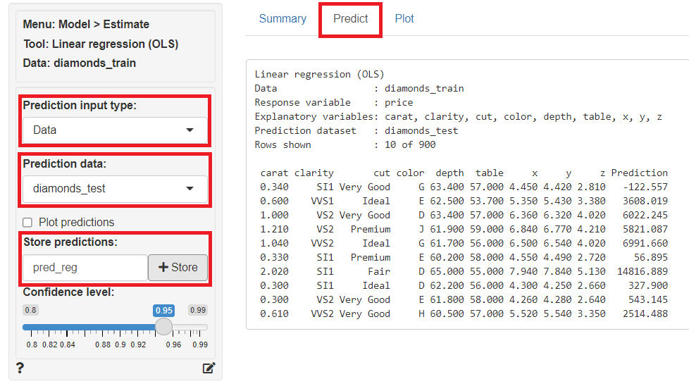 「Predict」をクリックし、左上の「Prediction Input type」に「Data」を指定、「Prediction data」に「diamonds_test」を指定すると、テストデータ(diamonds_test)の目的変数が予測されます。予測結果は、「Store predictions」に予測結果を保存する変数名(デフォルトではpred_reg)を入力し「+Store」ボタンをクリックすると、テストデータ(diamonds_test)にその変数が追加され保存されます。
