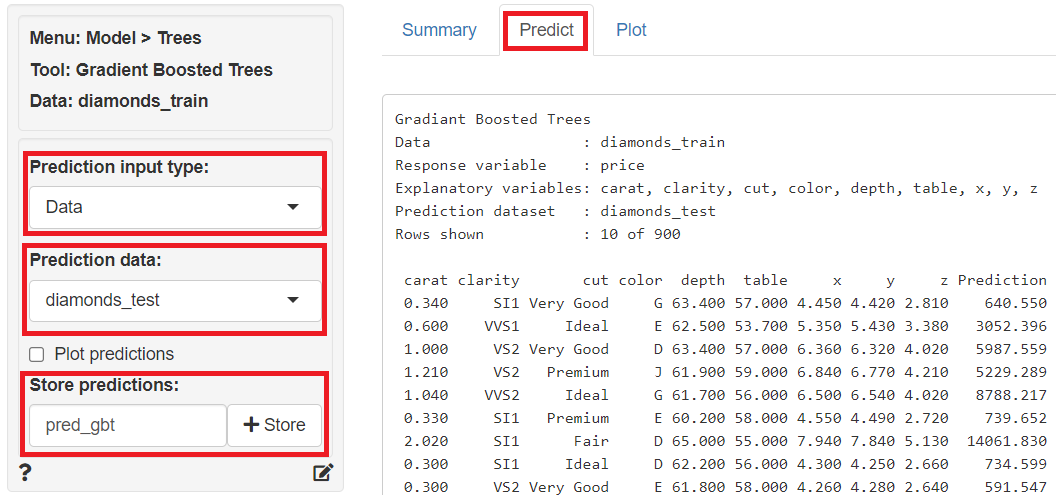 「Predict」をクリックし、左上の「Prediction Input type」に「Data」を指定、「Prediction data」に「diamonds_test」を指定すると、テストデータ(diamonds_test)の目的変数が予測されます。予測結果は、「Store predictions」に予測結果を保存する変数名(デフォルトではpred_gbt)を入力し「+Store」ボタンをクリックすると、テストデータ(diamonds_test)にその変数が追加され保存されます。