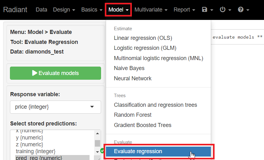メニューから「Model」を選択し「Evaluate regression」をクリックします。
