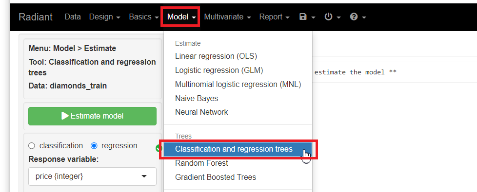 メニューから「Model」を選択し「Classification and regression trees」をクリックします。