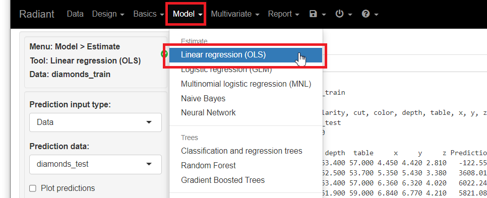 メニューから「Model」を選択し「Linear regression(OLS)」をクリックします。