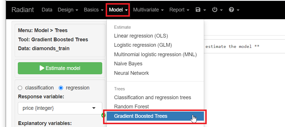 メニューから「Model」を選択し「Gradient Boosted Trees」をクリックします。