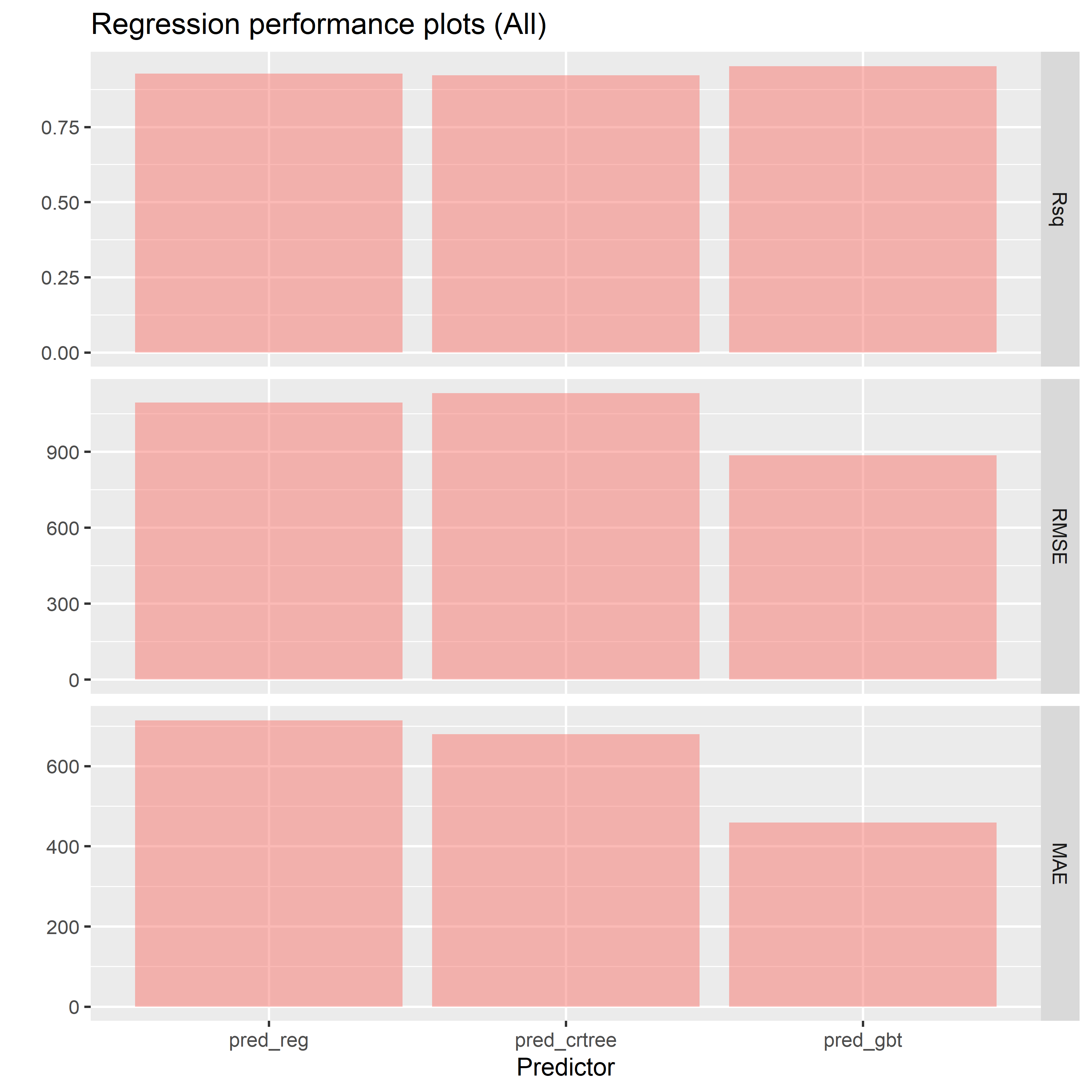 以下、R2(Rsq)とRMSE、MAEです。R2(Rsq)は値が大きいほど良く(最大1)、RMSEとMAEは値が小さいほど良い(最小0)です。