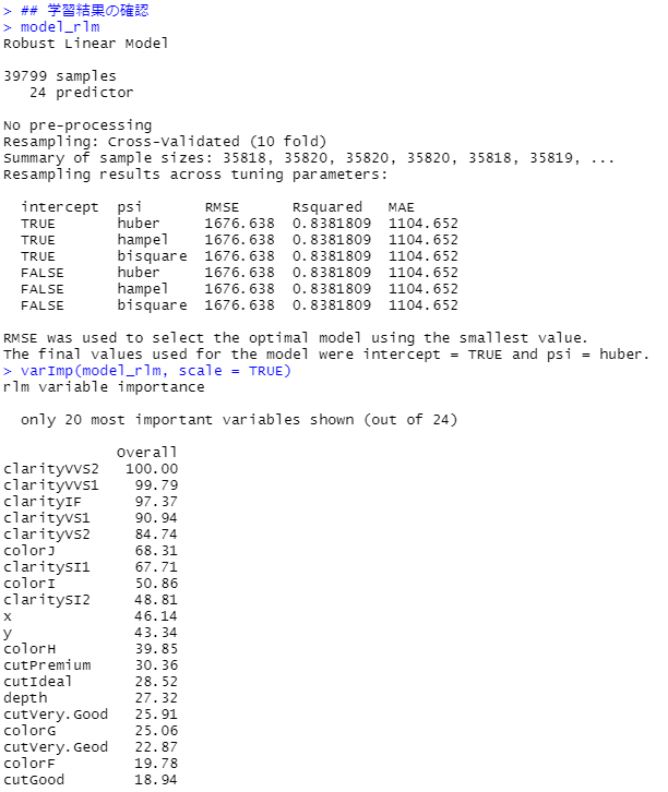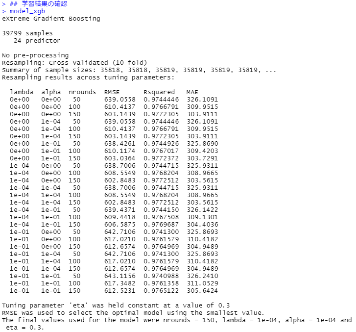# # データ分割 ---- # ## データ分割用の行番号生成 set.seed(100) trainNum <- createDataPartition(dataset$price, p=0.8, list=FALSE) ## 学習データ dataset_train <- dataset[trainNum,] y_train = dataset_train[,1] #目的変数 X_train = dataset_train[,-1] #説明変数(特徴量) ## テストデータ dataset_test <- dataset[-trainNum,] y_test = dataset_test[,1] #目的変数 X_test = dataset_test[,-1] #説明変数(特徴量)