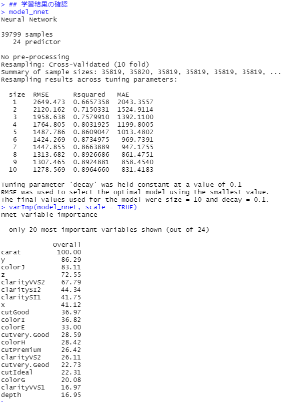 今回は回帰問題に対するニューラルネットワークですので「linout = TRUE」が必要になります。分類問題の場合は「linout = FALSE」です。
