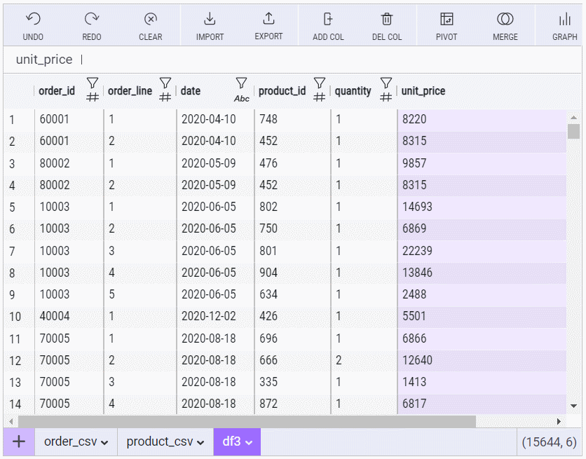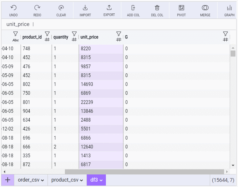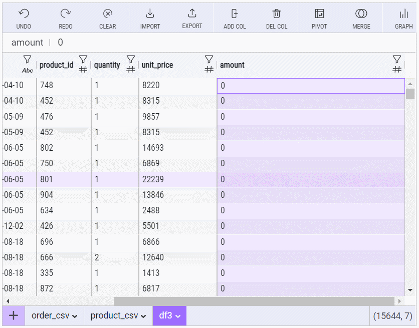 ……を掛け算し求めた金額(amount = quantity × unit_price)を新しいカラム(列、変数)に追加します。