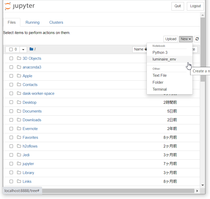 Jupyter Notebookを立ち上げると、追加した仮想環境を選択し使えるようになっています。