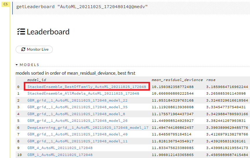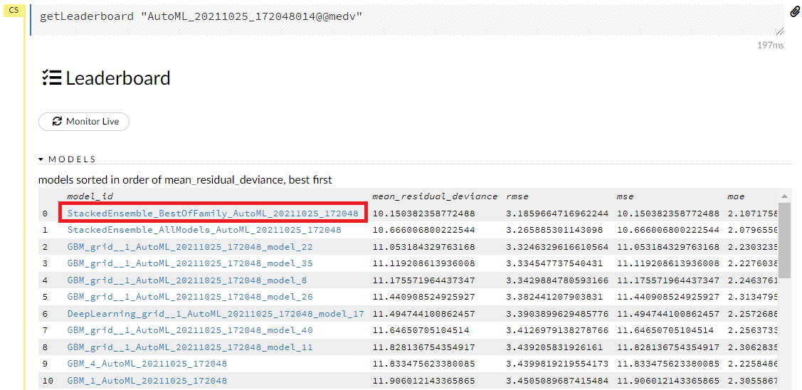 AutoMLで学習された全てのモデルが、より良いモデル順にソートされて表示されます。