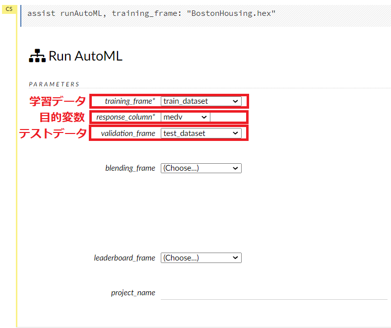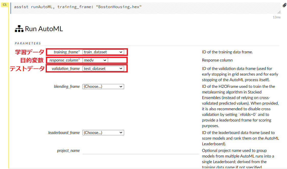 今回は、学習データ(例 train_dataset)とテストデータ(例 test_dataset)の指定と、目的変数(例 medv)の設定のみ実施しています(他はデフォルトの設定のまま)。