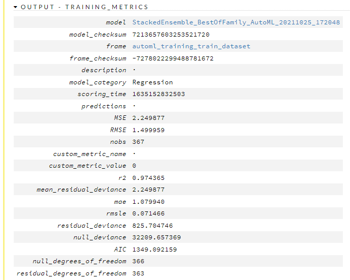 学習結果(学習データ)を見てみます。OUTPUT – TRAINING_METRICSのタブを開くと見れます。決定係数R2(r2)は0.974365です。