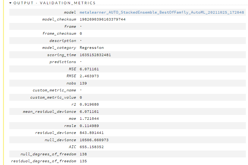 評価結果(テストデータ)を見てみます。OUTPUT – VALIDATION_METRICSのタブを開くと見れます。決定係数R2(r2)は0.919680です。