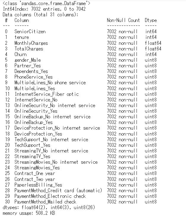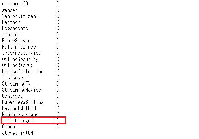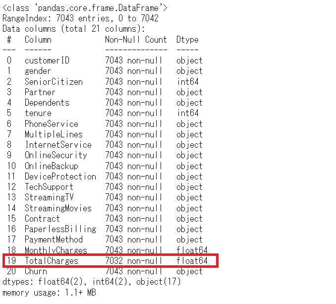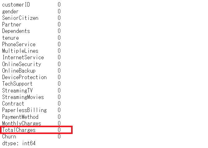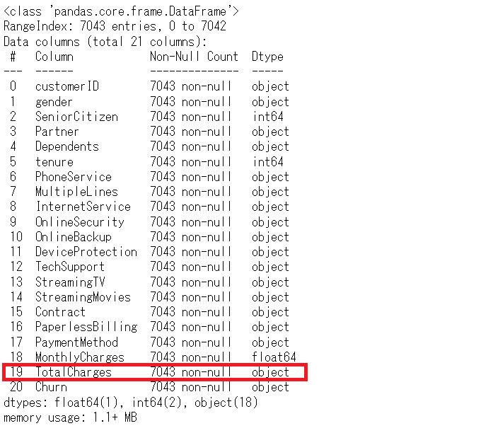 データセットを読み込んだときに、確認のために出力したデータセットの一部と見比べてもらうと分かりますが、数値であるべき変数「TotalCharges」がカテゴリカル変数になっています。欠測している箇所が空白になっていることが影響してそうです。