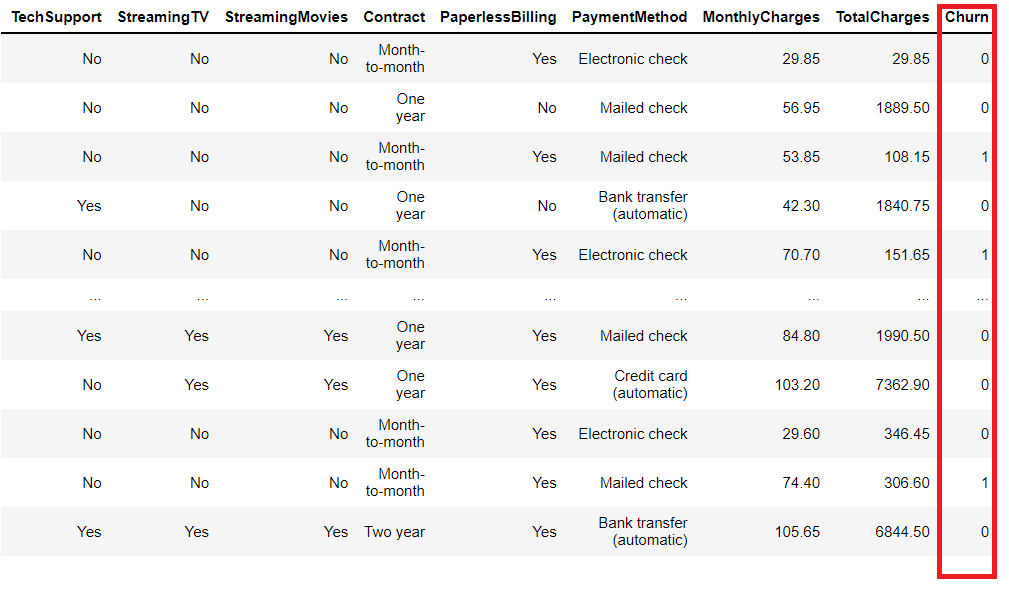 出力したデータセットの一部を見てもらうと分かりますが、変数「Churn」が「Yes」や「No」というテキストが入力されています。