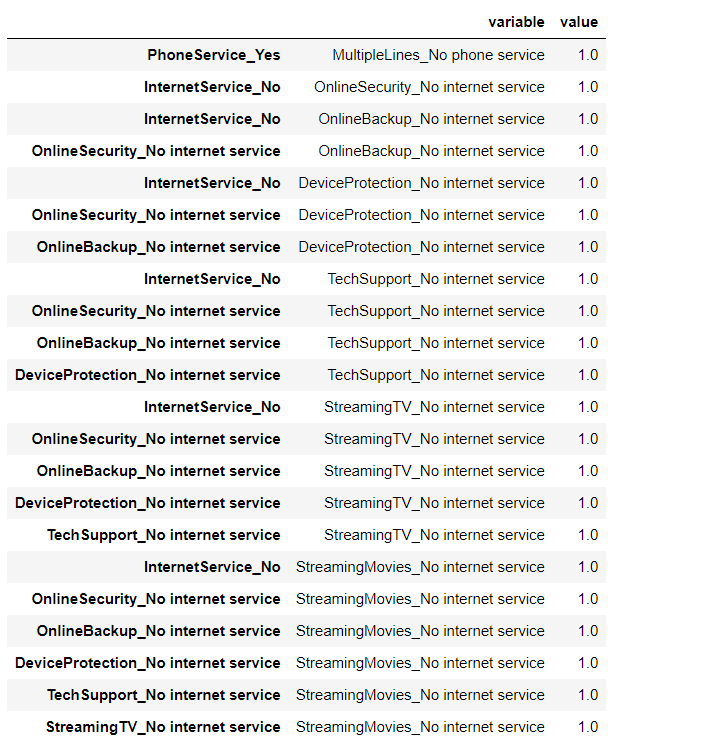 # 高相関(相関係数の絶対値がほぼ1の変数の組み合わせ)を抽出 df_corr_melt = res.melt(ignore_index=False).dropna(how='any') df_corr_melt[df_corr_melt.value >= 0.99999]