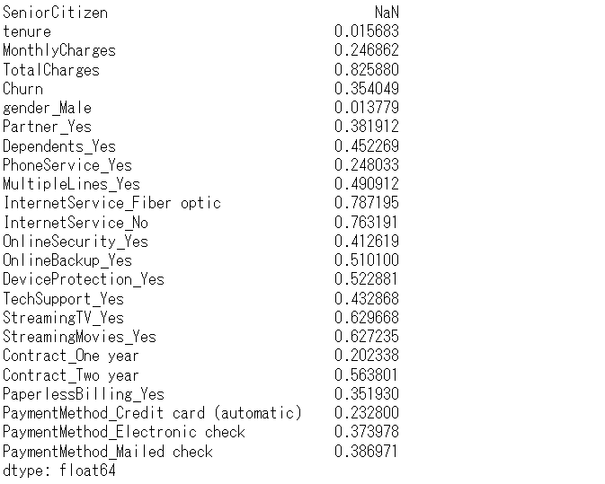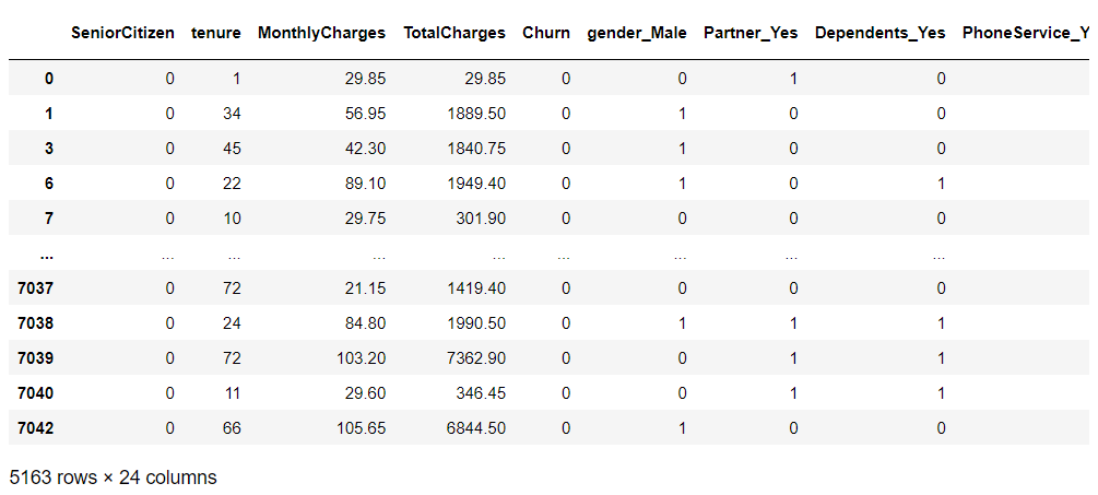 # 継続顧客(離反していない顧客)データの抽出 customers_data = df_dummy[df_dummy['Churn'] == 0] customers_data #確認