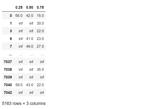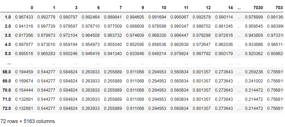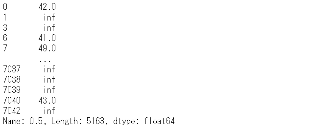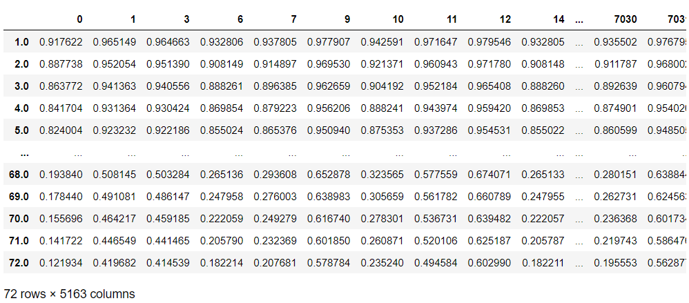 # 継続顧客の生存関数の修正(条件付き生存関数) pred_survival_new = pred_survival.apply(lambda c: (c / c.loc[df_dummy.loc[c.name, 'tenure']])).clip(upper=1) pred_survival_new #確認