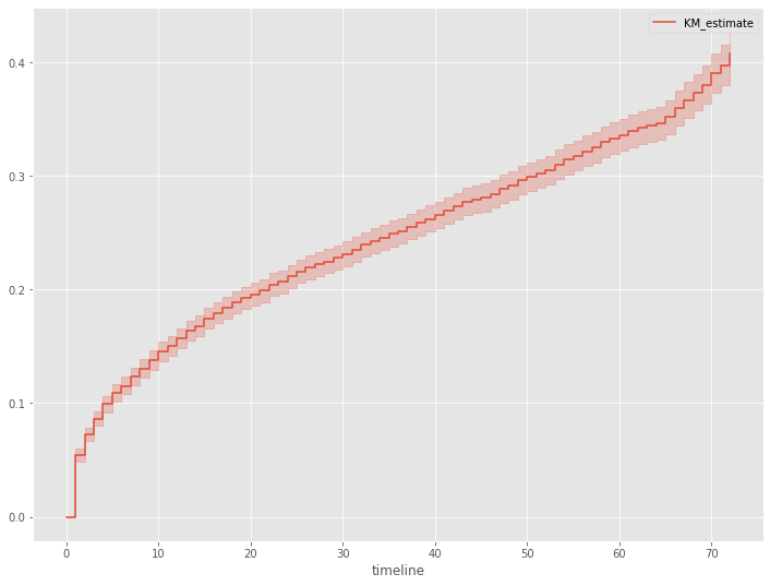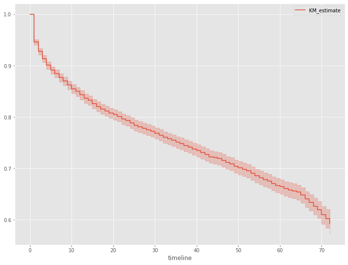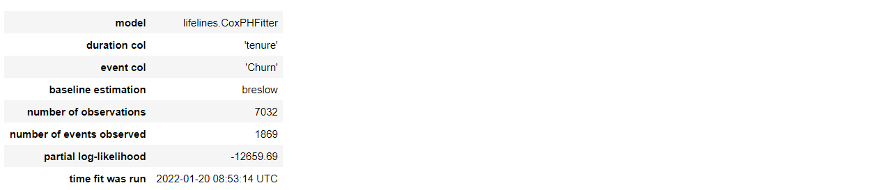 # カプランマイヤー推定 T = df['tenure'] #生存期間(契約期間) E = df['Churn'] #イベント生起(離反) kmf = KaplanMeierFitter() kmf.fit(T, event_observed=E)