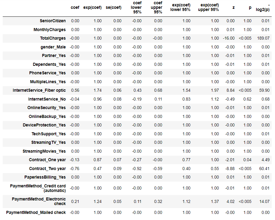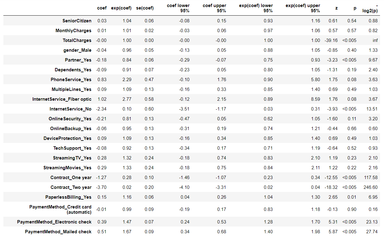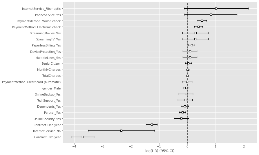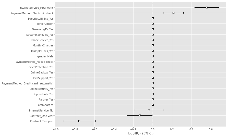 # Cox比例ハザード回帰 cph = CoxPHFitter() cph.fit(df_dummy, duration_col='tenure', event_col='Churn') cph.print_summary() #サマリー cph.plot() #係数