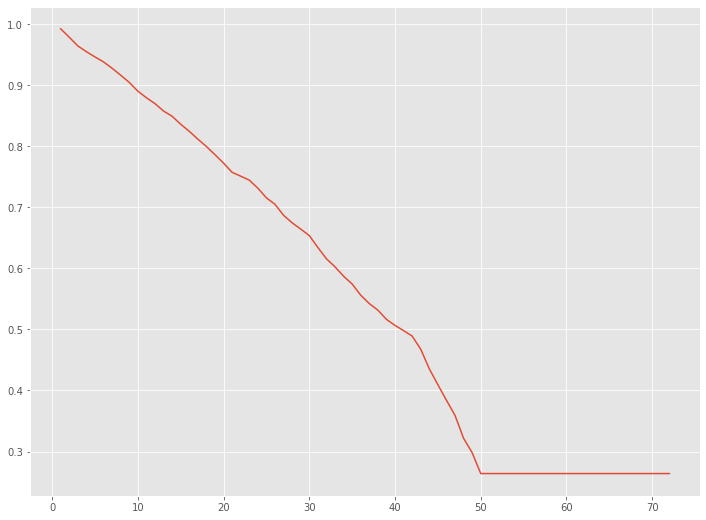 # 打ち切り後の未来 ## 特定の継続顧客の生存関数のグラフ化 customer = 6 pred_survival_new_remain[customer].plot(label="pred_survival_new")