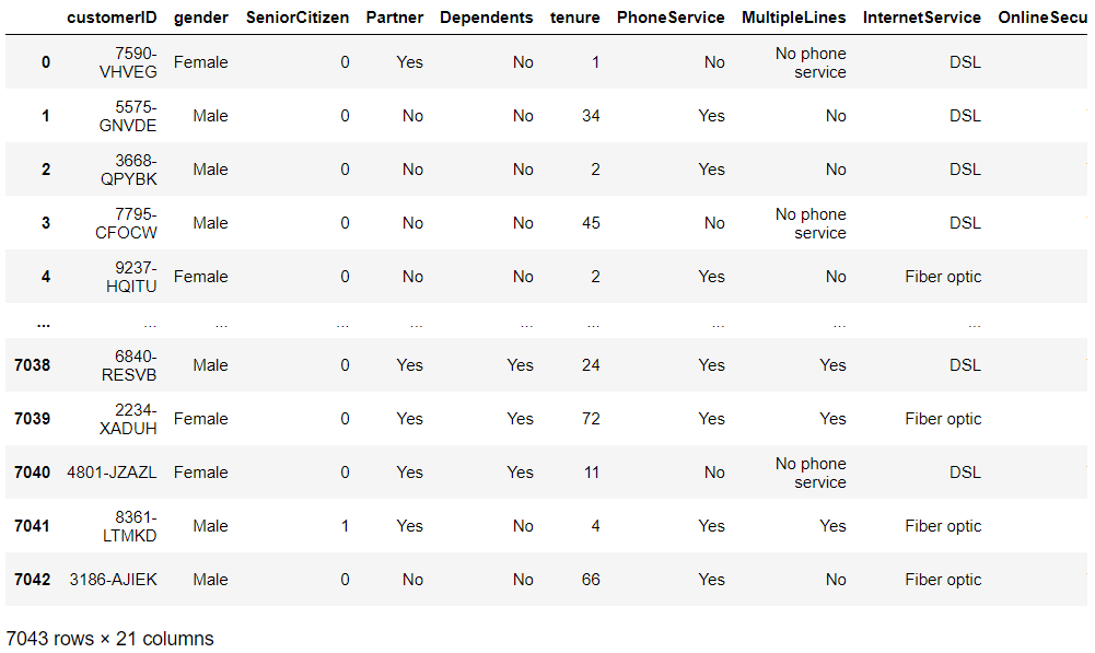 # データセットの読み込み data_path = 'C:\dataset\WA_Fn-UseC_-Telco-Customer-Churn.csv' df = pd.read_csv(data_path) df #確認