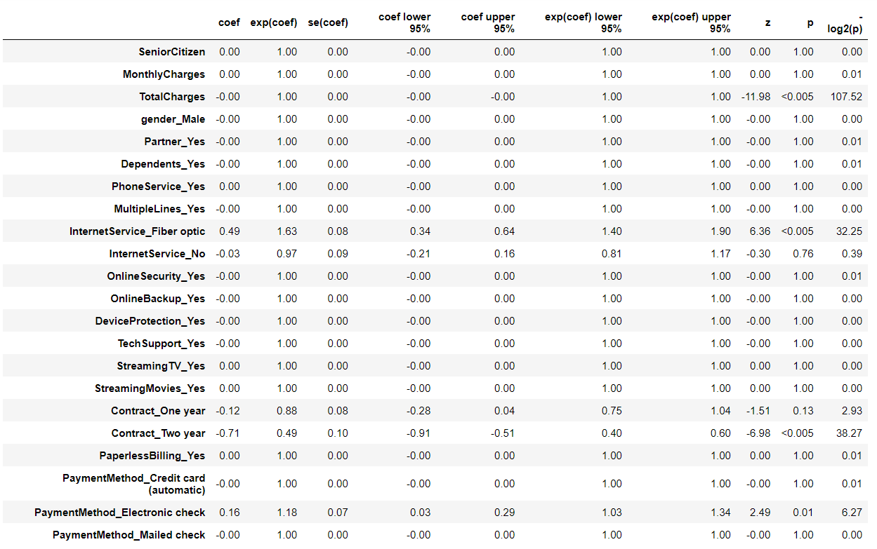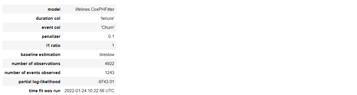 そこで、全データセット(学習データとテストデータに分ける前のデータセット)を使い、Cox比例ハザード回帰モデルを構築し、まだ離反していない継続顧客の離反時期を予測をしてみたいと思います。