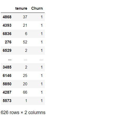 # 離反顧客の抽出 df_dummy_test[['tenure','Churn']][df_dummy_test['Churn'] == 1]