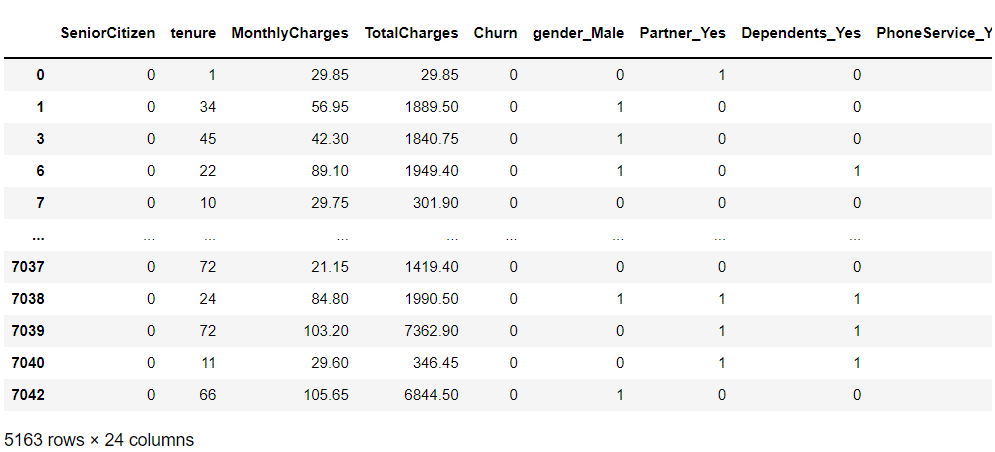 # 継続顧客(離反していない顧客)データの抽出 customers_data = df_dummy[df_dummy['Churn'] == 0] customers_data #確認