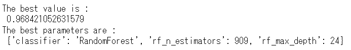 ……ただ、先程の例ではロジスティック回帰、SVM、ランダムフォレストの3つのアルゴリズム(数理モデル)を対象にしているため、OptunaのCV関数(OptunaSearchCV)を使った例と見比べるとき、やや面倒です。