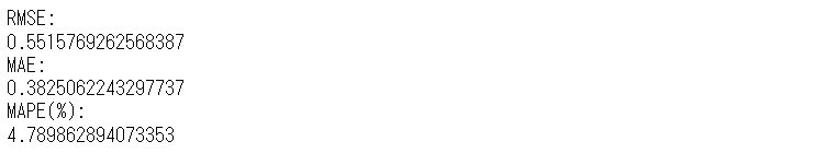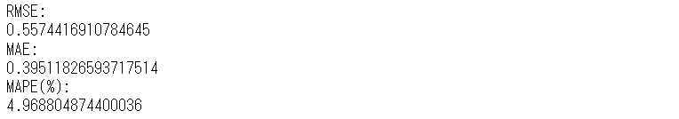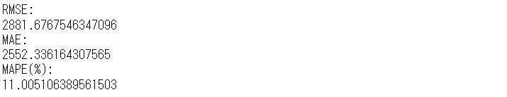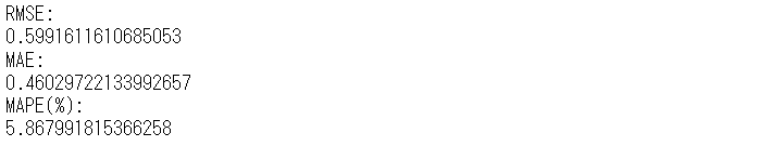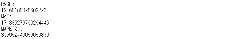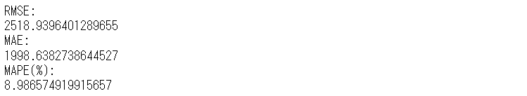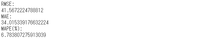 予測精度評価で利用する指標は、二乗平均平方根誤差(RMSE、Root Mean Squared Error)と平均絶対誤差(MAE、Mean Absolute Error)、平均絶対パーセント誤差(MAPE、Mean absolute percentage error)です。