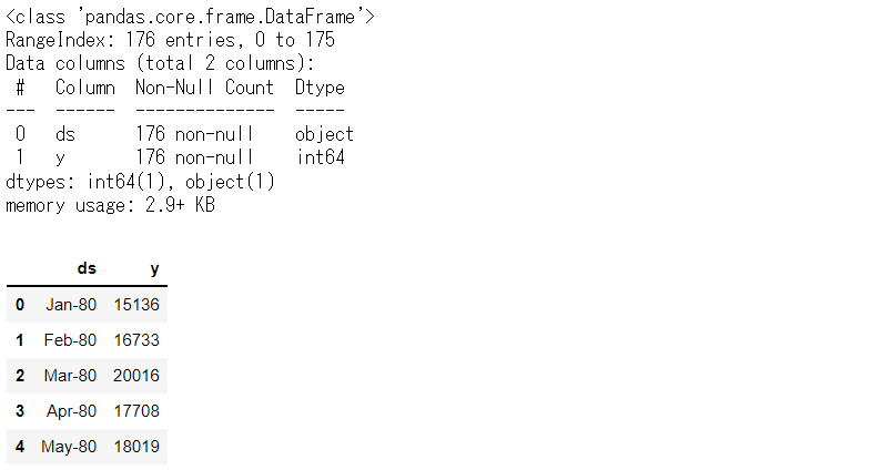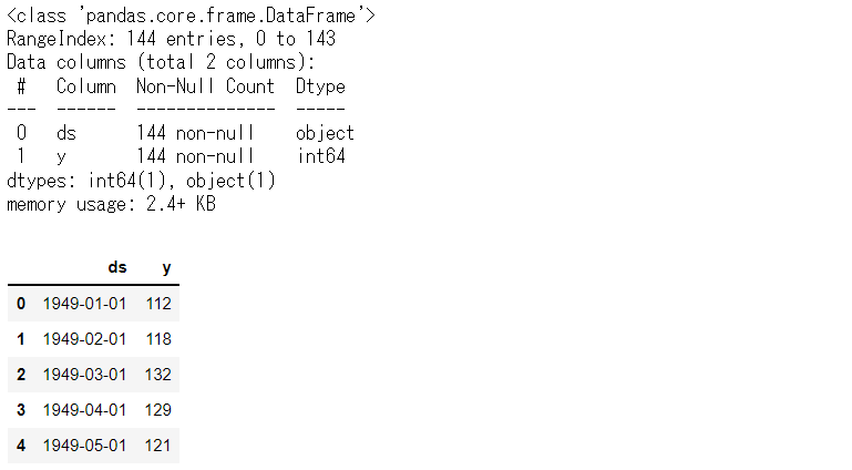 # 学習データとテストデータの分割 test_length = 12 df_train = df.iloc[:-test_length] df_test = df.iloc[-test_length:]
