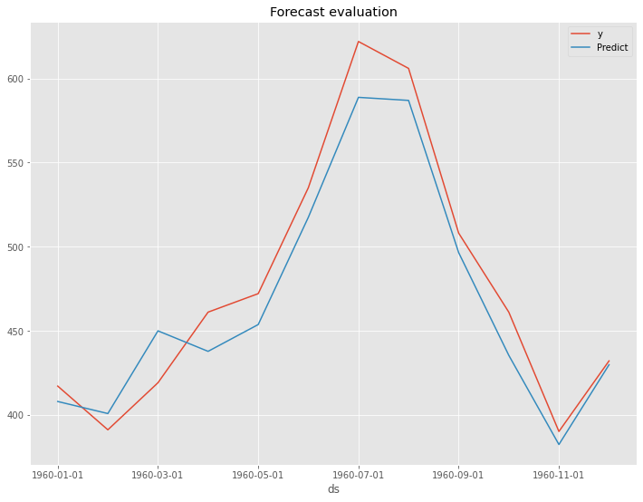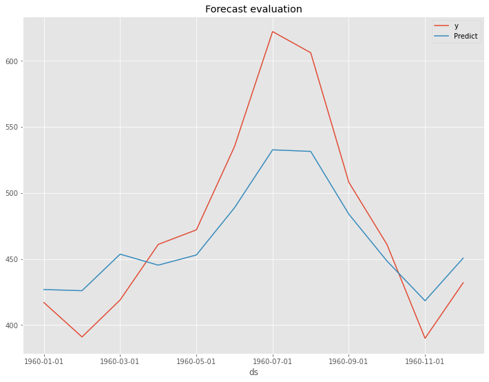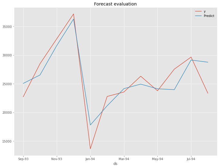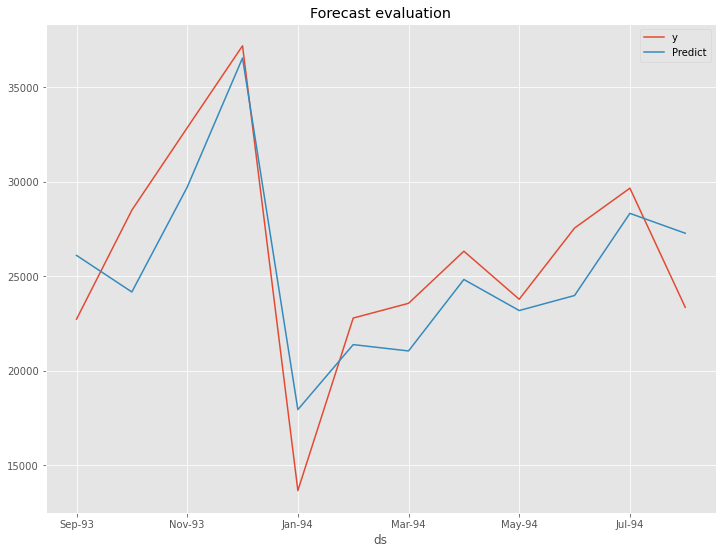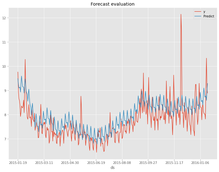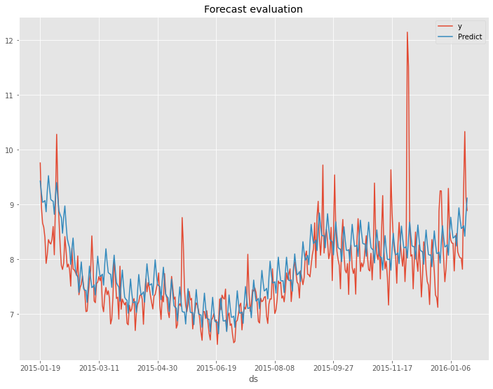 デフォルトの設定のままで、Prophetの時系列モデルを構築し、構築したモデルをテストデータで精度検証します。