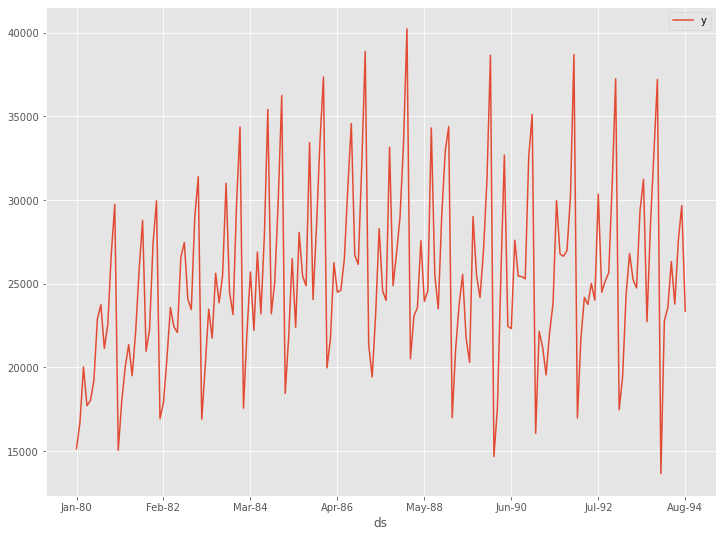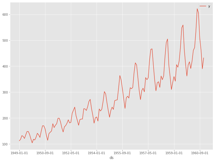 # データセット読み込み url = 'https://www.salesanalytics.co.jp/l6p7' df = pd.read_csv(url) df.columns = ['ds', 'y'] # データ確認 df.plot(kind='line',x='ds', y='y') df.info() #変数の情報 df.head() #データの一部