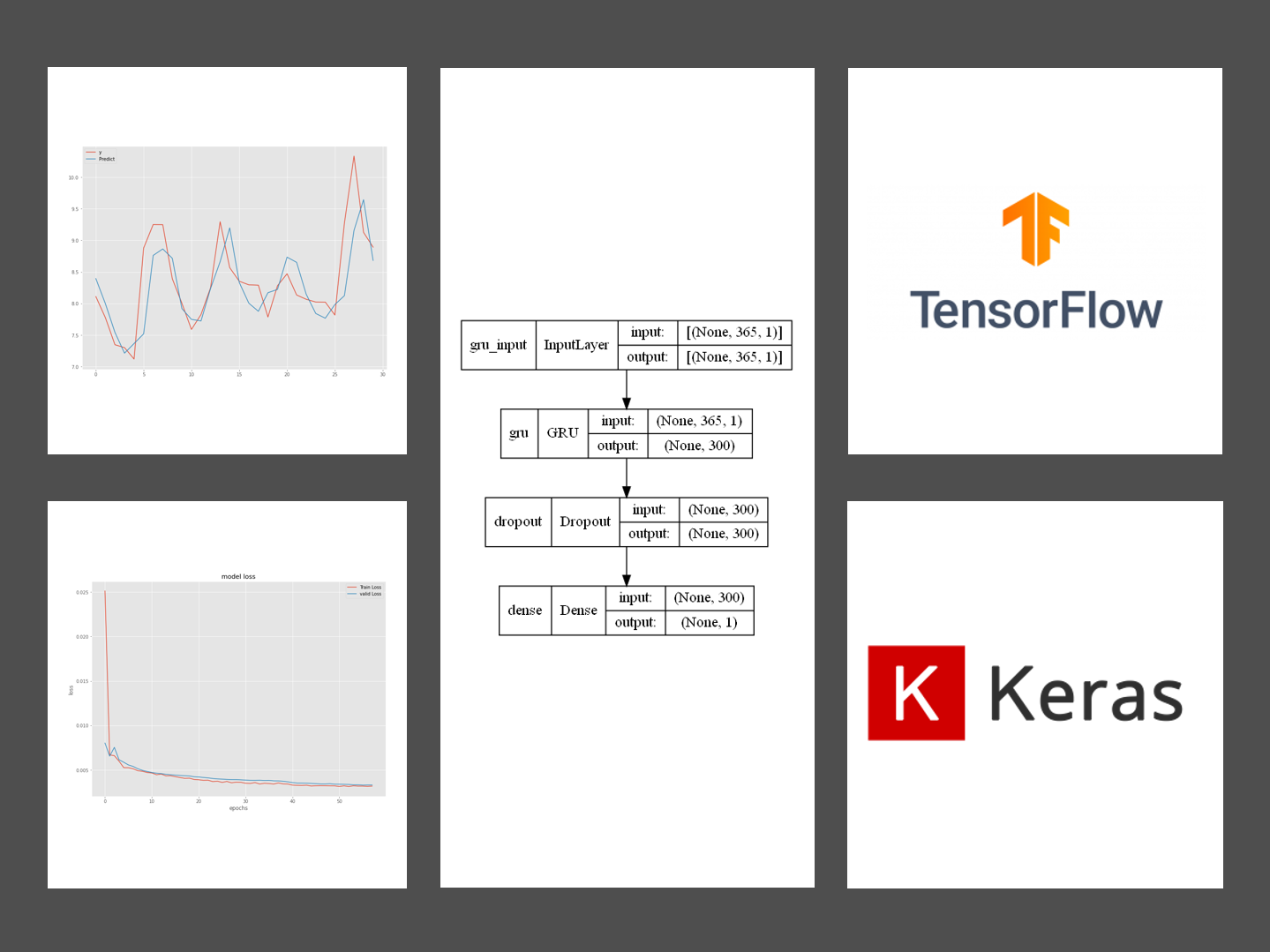 中間層にGRU層を持ったニューラルネットワークを、ラグ変数Xをタイプステップ(time_steps)とした学習データで構築していきます。